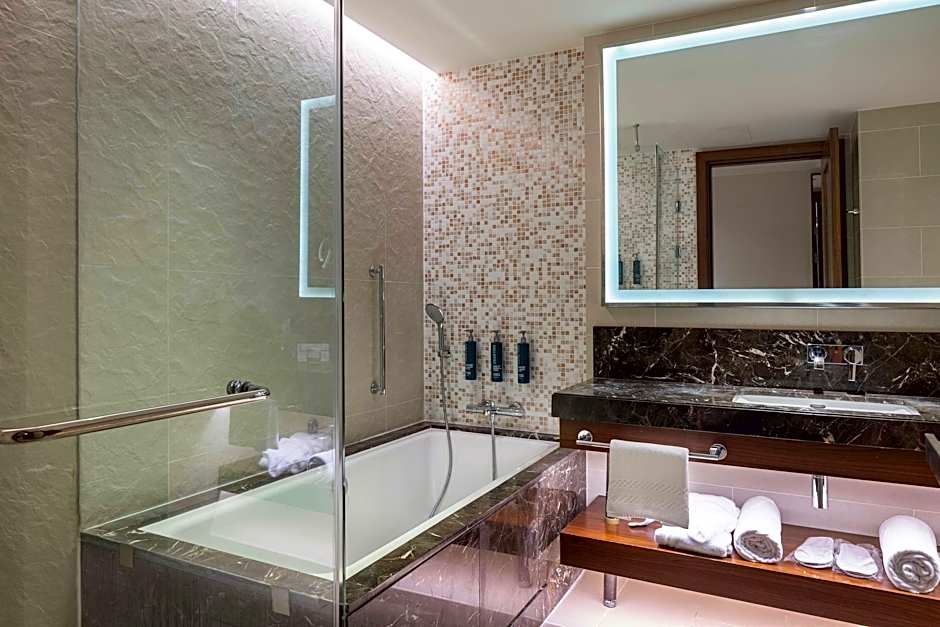Relax in this modern 33 square yard executive room with a stunning city view. Guests enjoy a luxurious king-sized Hilton Serenity Bed and large bathroom with a separate bathtub and walk-in rain shower.