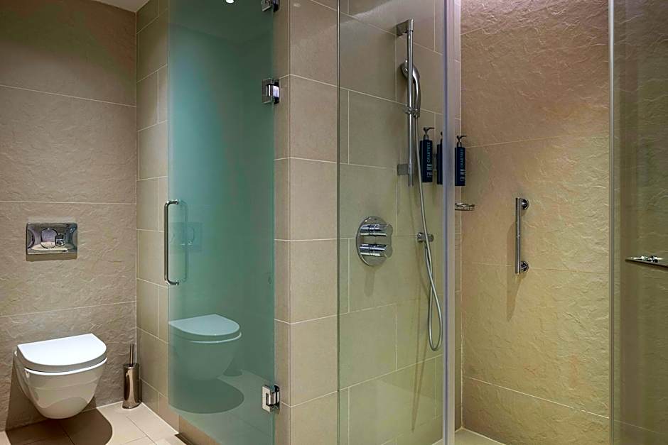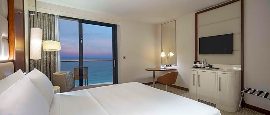 Relax in this modern 33 square yard King Guest Room with a stunning view of the sea . Get a good night sleep in the King-sized Hilton Serenity Bed and refresh in the spacious bathroom with a walk-in rain shower.